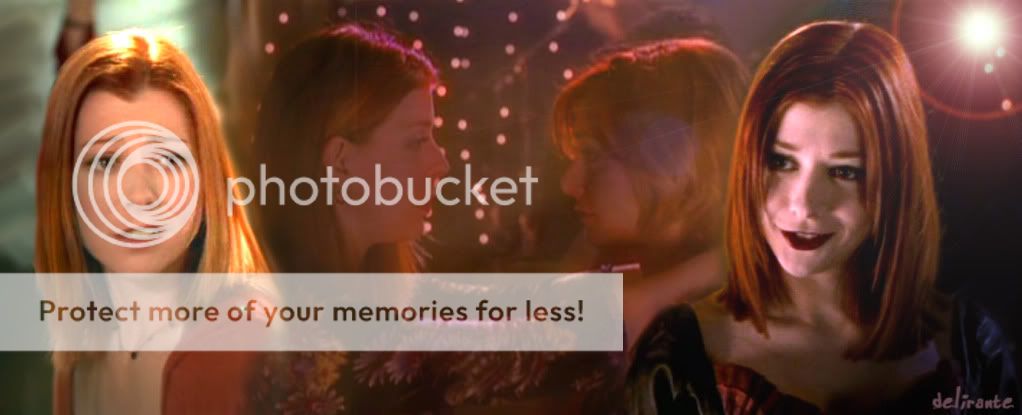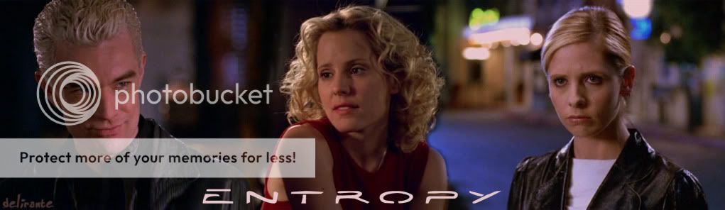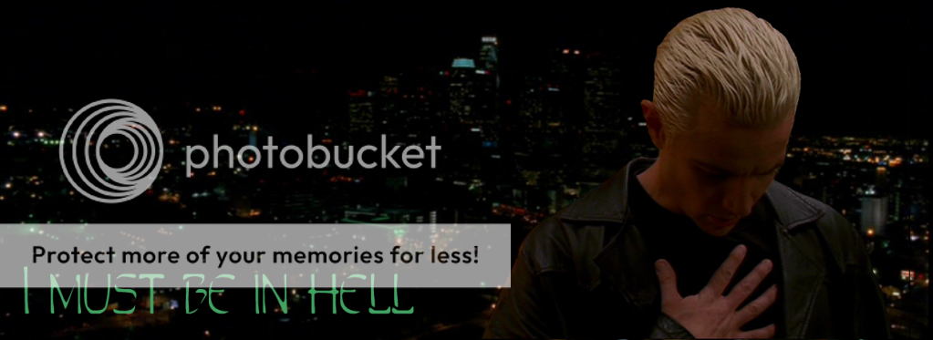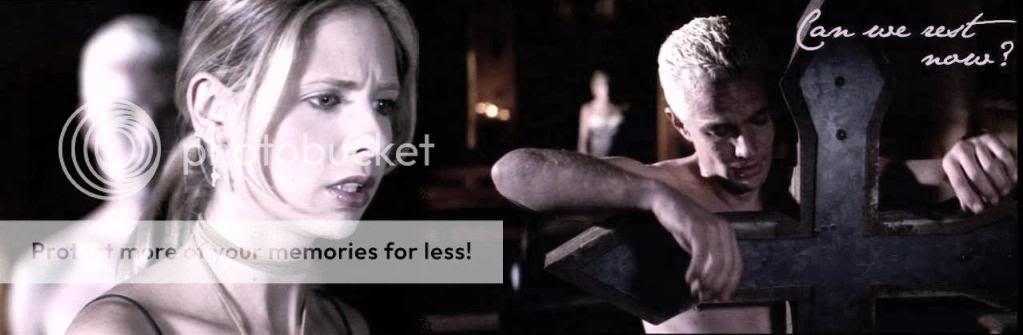 Con el texto estaba dudando porque la segunda frase no me gusta mucho: da a entender que Spike no mata a Angel para que Buffy no se mosquee con él, y me parece que el motivo no es ese. Spike no habría matado a Angel igual aunque no estuviera Buffy. Si tomamos la frase en literal me parece que le quita importancia a la historia de los dos vampiros, que es de lo que va Destiny. Al final la he dejado porque me gusta más la imagen con texto arriba y abajo, me parece que queda más equilibrado, y porque me he convencido de que Spike lo dice sólo por fastidiar a Angel, para quitarle importancia al hecho de que le acaba de perdonar la vida, que es bastante humillante para el moreno. Y para que no piense que le importa.
